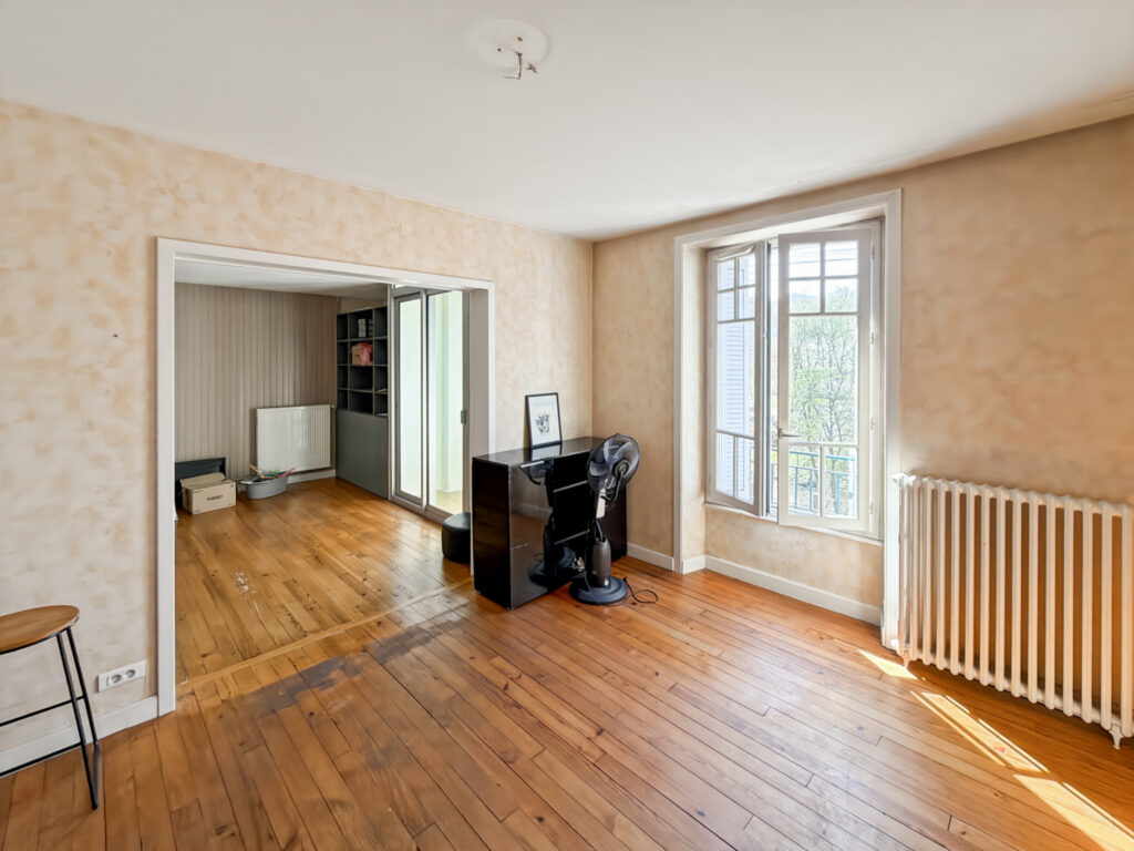 Chauffage au gaz de ville – Radiateurs fonte – Syndic bénévole – 1er étage – VMC – Jardin privatif – Box – Double vitrage – Menuiseries bois – Peu de travaux à prévoir.