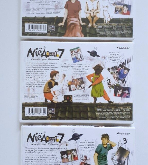 Coffret intégral animé NiëA 7, 3 DVD, version japonaise, sous-titrée en français. Histoire intégrale. Les 3 DVD et leurs boitiers sont en parfait état. Le coffret est en très bon état.Prix : 5€