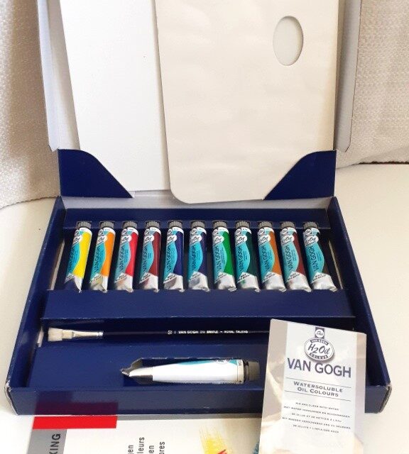 Coffret Van Gogh Talens, couleurs à l’huile soluble à l’eau. Contient 11 tubes couleurs de 20ml + 1 tube blanc de 40ml + 1 pinceau série 210/10 (il manque le pinceau 211/4 qui n’est plus dans le coffret) + 1 carton à peindre entoilé 24x30cm (2 petites traces de peinture visibles sur photos de l’annonce) + 1 palette détachable neuve encore sous blister + 1 dépliant d’instructions + 1 dépliant avec carte de mélange de couleurs. La boite a des signes d’usures visibles sur les bords et coins, mais les tubes et le matériel sont neufs et n’ont jamais été utilisés. J’ai d’autres matériel de loisirs créatifs à vendre.