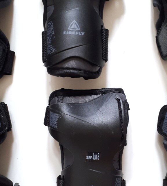 Set de protections contenant protège poignets, coudières et genouillères. Convient pour vélo ou rollers, taille S pour enfant (correspond à 4-9 ans, poids entre 18 et 25 kg). Marque Firefly Intersport. En très bon état.Prix : 8€