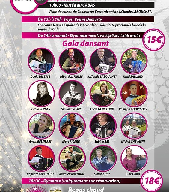 Samedi, gala dansant avec Denis Salesse, Sébastien Farge, Jean-Claude Labouchet, Rémi Sallard, Nicole Bergès, Guillaume Fric, Lucia Genilloud, Philippe Rodrigues, Anaïs Bessières, Marc Picard, Sabine Bel, Michel Chevarin, Baptiste Guichard, Mathieu Martinie, Simone Rey, Gilles Saby