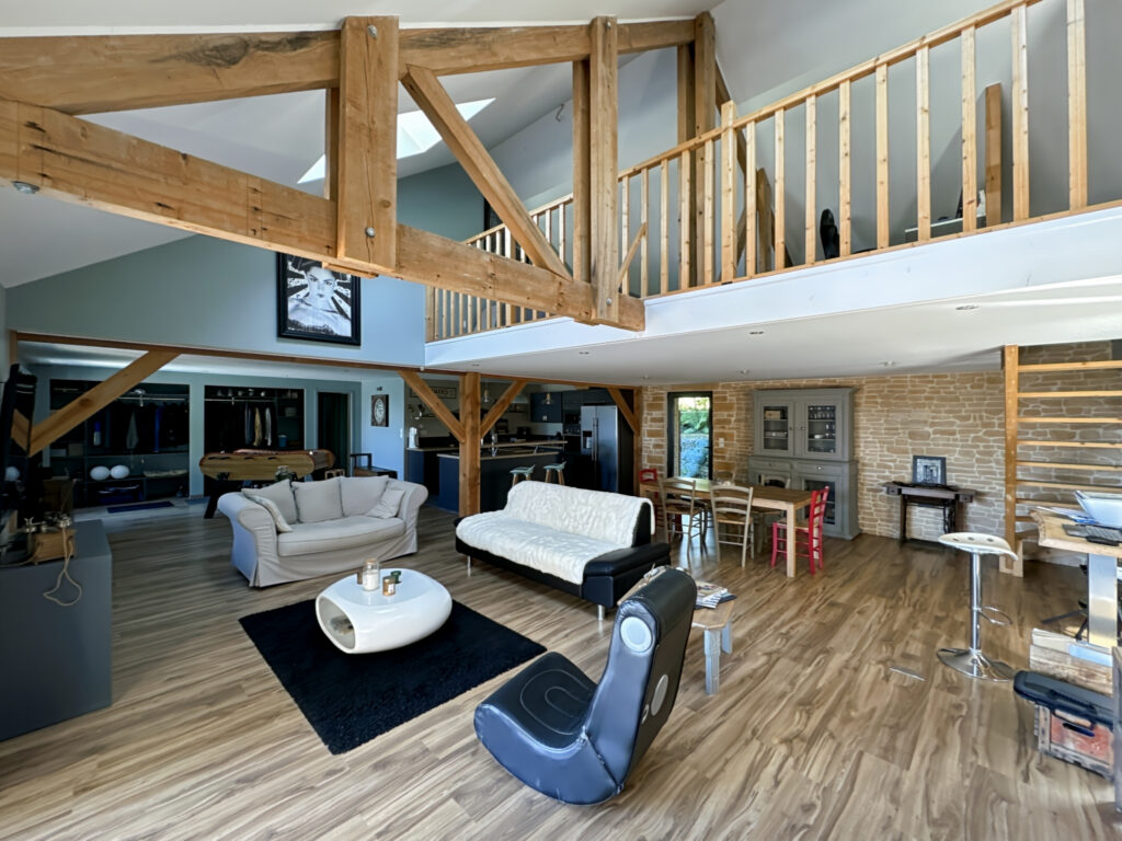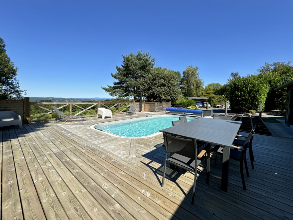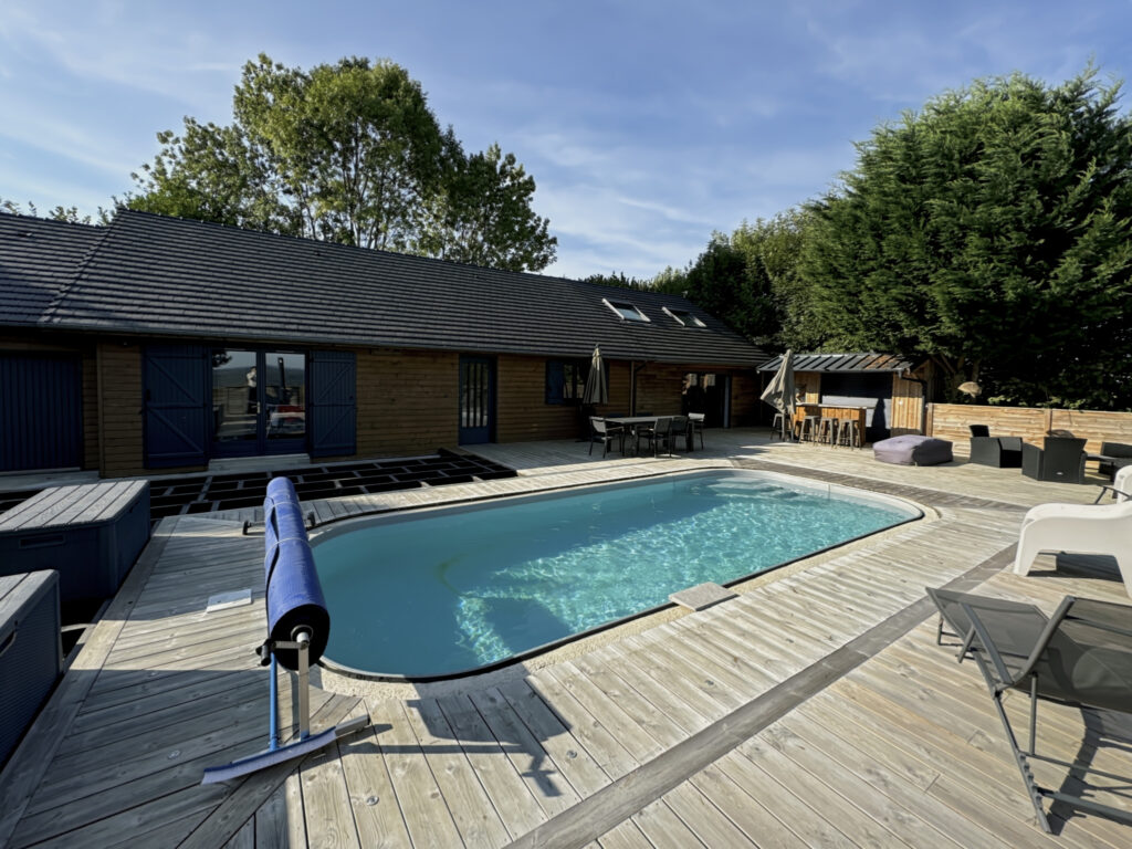 Construction en bois – Toitures tuiles – Charpente traditionnelle – Combles aménageables – Fenêtres double vitrage – Menuiseries aluminium – Volets roulants électriques – Poêle à granulés – Ballon d’eau chaude thermodynamique – Garages – Stationnement – Terrain clôturé et arboré – Cuisine d’été – Bar – Terrasses – Atelier – Stationnement – Tout-à-l’égout – Piscine chauffée – Salle d’eau extérieure – Rangements.