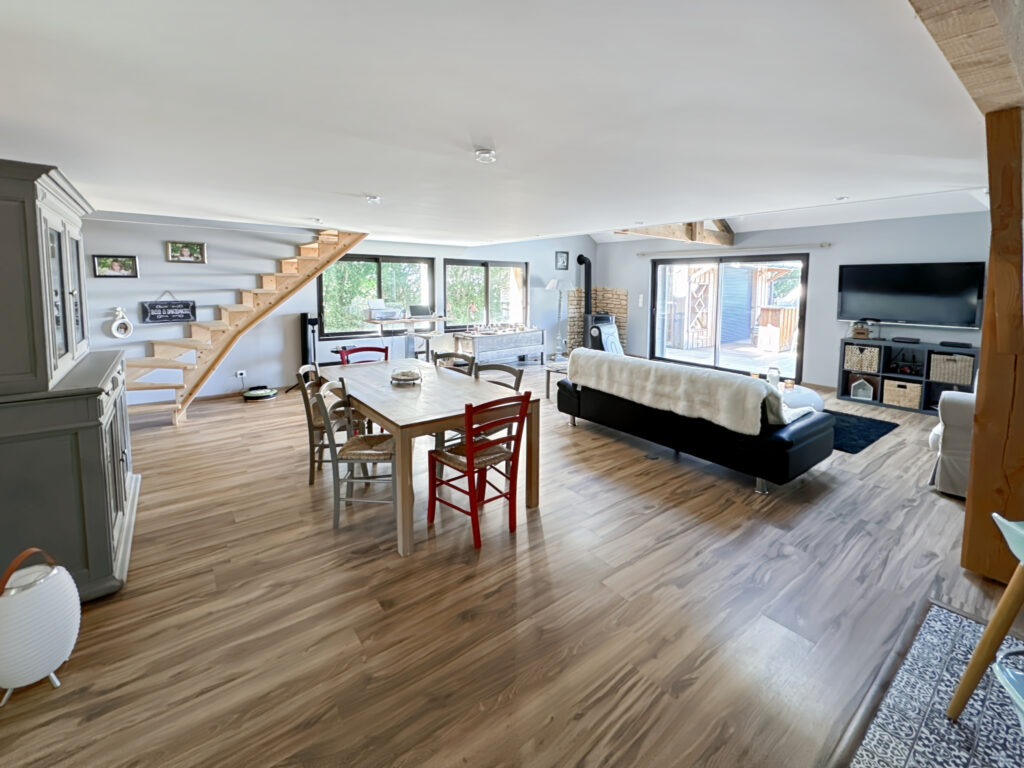 Au rez-de-chaussée : entrée, dégagement couloir, une cuisine ouverte aménagée et équipée, un grand séjour/salle-à-manger, deux chambres, une salle d’eau et un cabinet d’aisance. Mezzanine et combles aménageables.