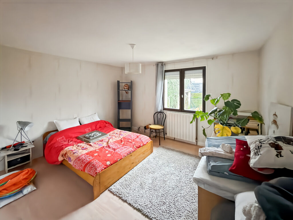 Construction en brique semi-enterrée à un étage – Toiture en tuiles – Charpente traditionnelle – Grenier – Fenêtres simple vitrage – Menuiseries bois – Volets roulants manuels – Fenêtres de toit – Chauffage au gaz de ville – Insert – Tout-à-l’égout – Garage – Cave – Atelier – Jardin clôturé – Terrasse.