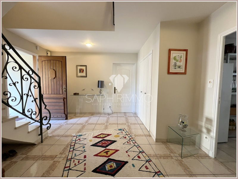 – au rez-de-chaussée : une vaste entrée desservant une buanderie, un grand bureau (avec porte d’entrée indépendante côté rue) actuellement aménagé en salle de sport, une suite parentale, un wc indépendant, une buanderie avec accès direct au jardin – accès au garage par l’entrée également ;