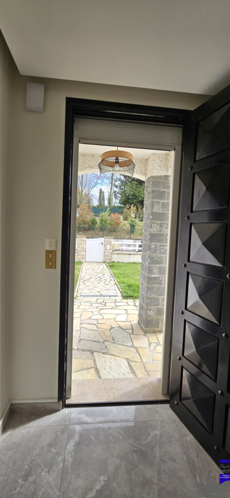 Au rez-de-chaussée, vous découvrirez un vaste hall d’entrée, un séjour chaleureux équipé d’un poêle à granulés, ainsi qu’une cuisine moderne, aménagée et entièrement équipée. L’espace nuit comprend trois chambres, dont une avec dressing, une salle de bains avec double vasque, un WC avec lave-mains, ainsi que de nombreux rangements intégrés dans le couloir.
