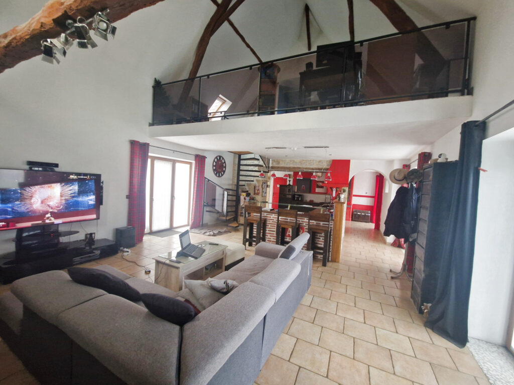 A l’étage : 2 chambres avec rangements et une 3ieme chambre équipée d’un dressing, un wc séparé et une salle de bain avec douche et baignoire . Le tout étant complété par une mezzanine de plus de 16M2 faisant office de bureau – bibliothèque surplombant le salon.