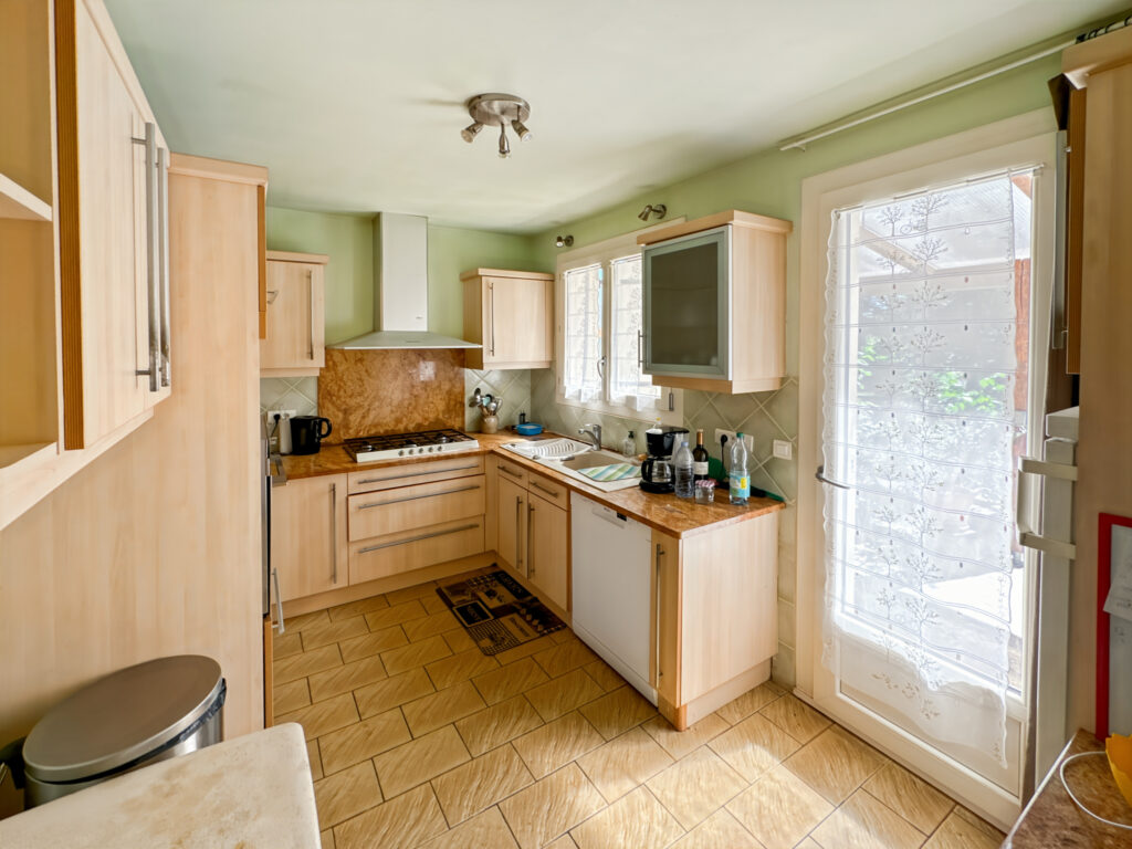 En rez-de-jardin : entrée, dégagement couloir, une cuisine aménagée et équipée, un séjour/salle-à-manger, une chambre, une salle d’eau et un cabinet d’aisance.