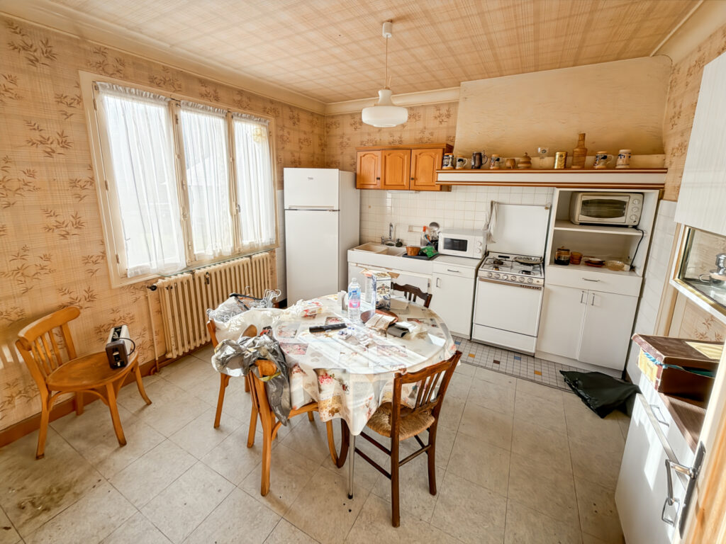 À l’étage : dégagement couloir, deux chambres, une salle d’eau, un cabinet d’aisance, une cuisine et un séjour/salle-à-manger.