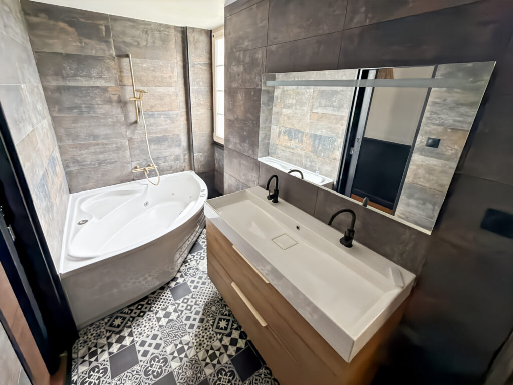 Au premier étage : un séjour/salle-à-manger, une cuisine aménagée et équipée, une chambre avec dressing, dégagement couloir, une salle de bains et un cabinet d’aisance.