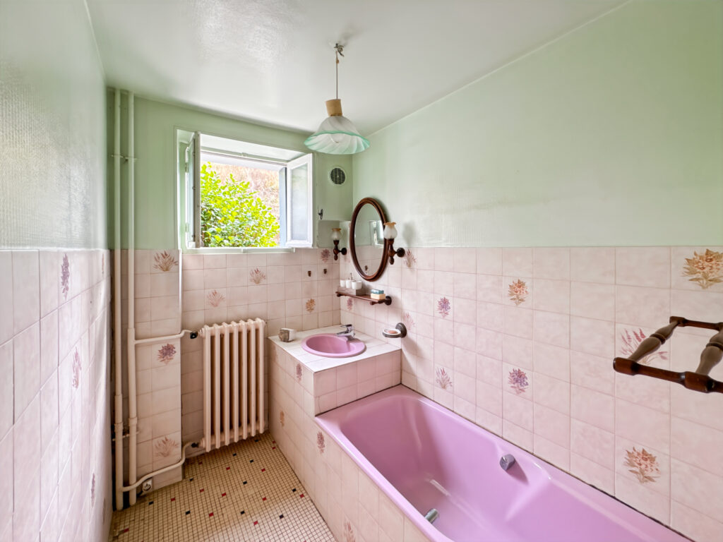 À l’étage : dégagement couloir, deux chambres et une salle de bains avec un cabinet d’aisance.