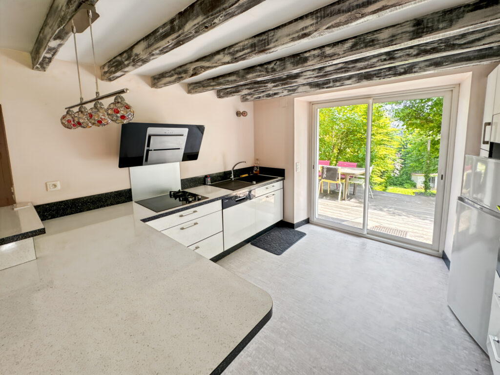 Au rez-de-jardin : une buanderie, un cellier, une cuisine ouverte aménagée et équipée et un séjour/salle-à-manger.