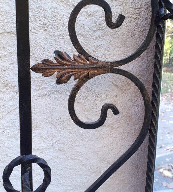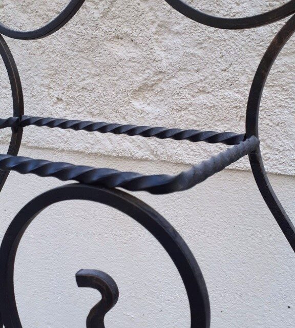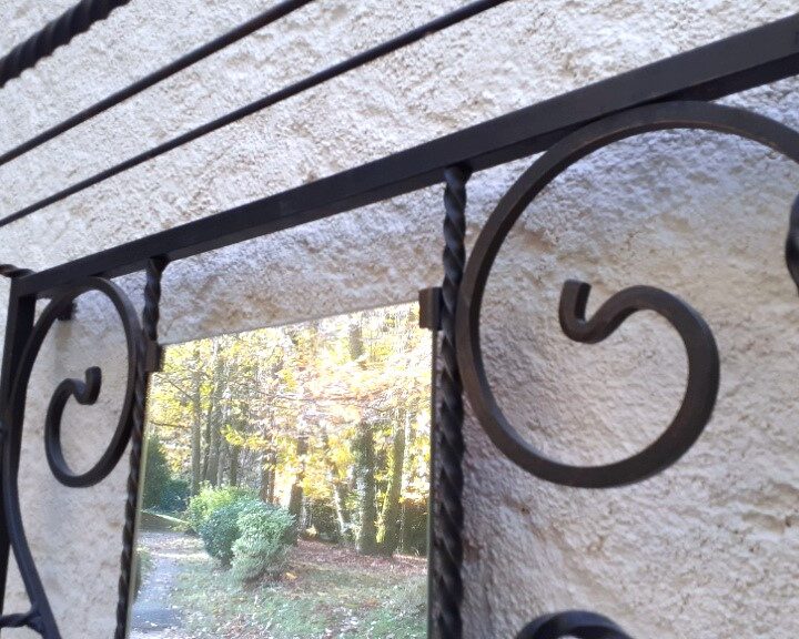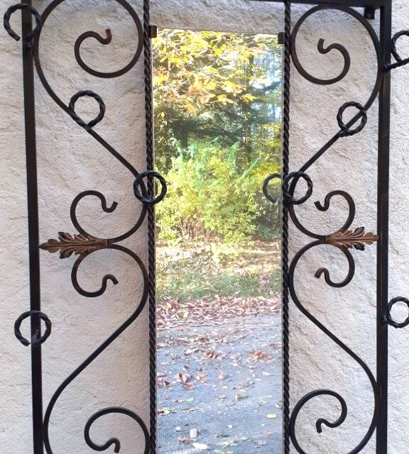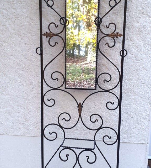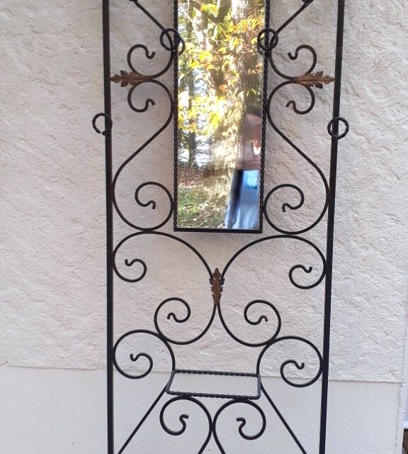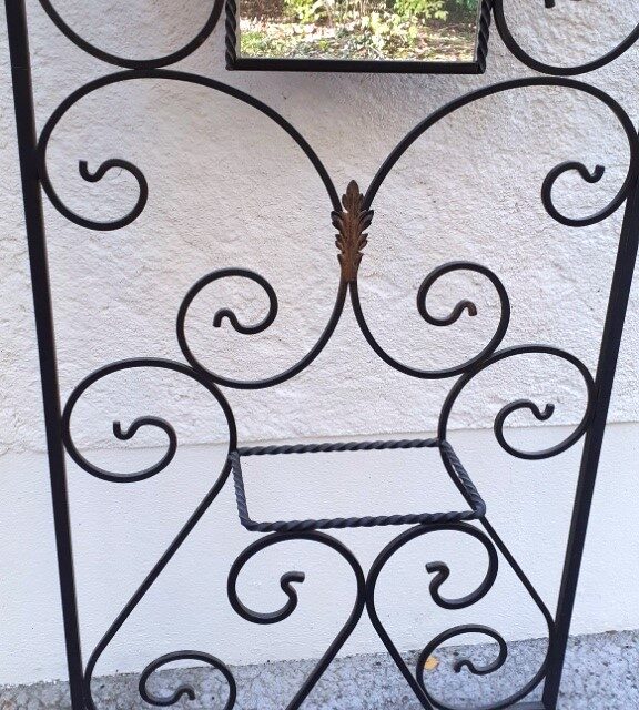 Portique porte manteaux, serviteur d’entrée, en fer forgé noir, motif feuilles, avec miroir. Propre et en très bon état, le miroir aussi. Hauteur totale 180cm. Largeur totale 67cm. Profondeur 20cm.Dimensions du miroir 80x24cm.