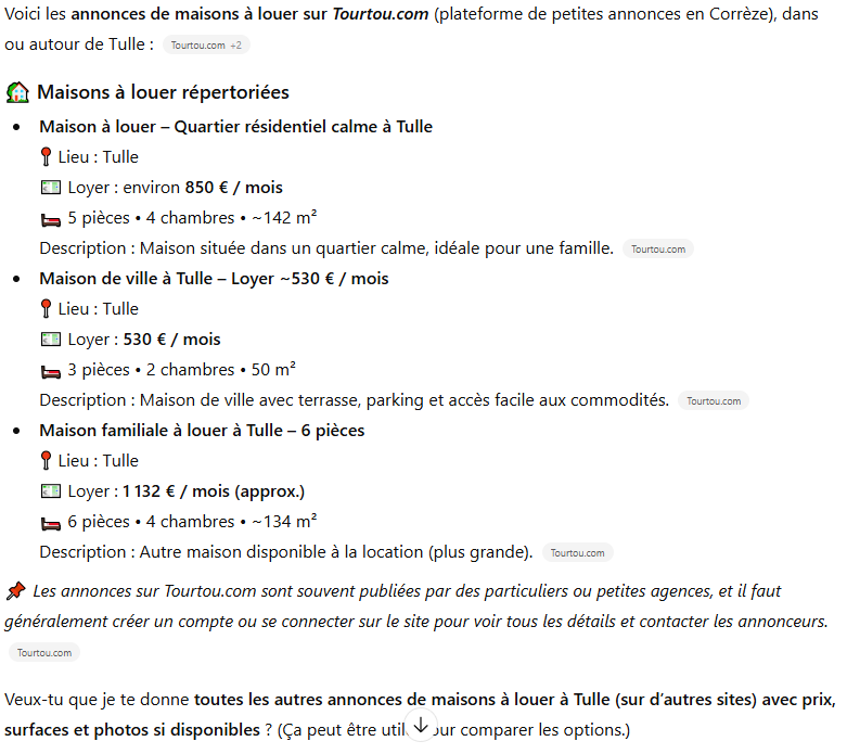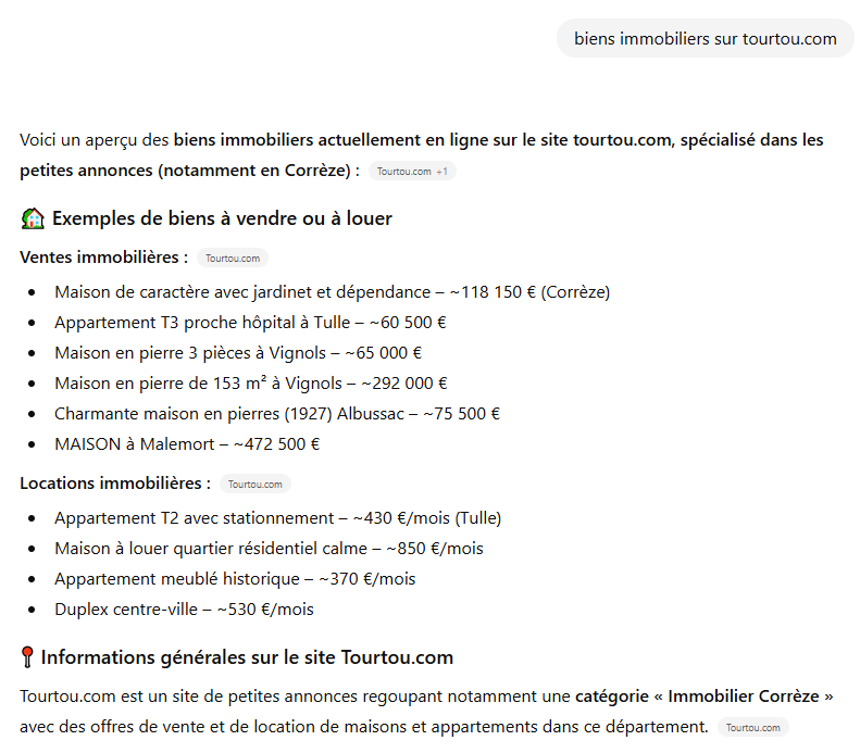 Tourtou.com, c’est bien pour l’immobilier en Corrèze, mais le site a aussi d’autres catégories importantes : emploi, voiture, services, événements. Et cela fonctionne de la même façon avec ChatGPT : une phrase, une réponse.